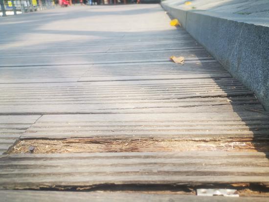 4月13日下午,深晚记者来到市民所反映的地方。记者在一条近200米长的人行木栈道上发现有多处破损迹象。有两块栈道木条还存在松动的情况,有些木条经过长期的日晒雨淋,自然破损严重,就连钉在木条上的钉子都暴露在外面了。由于破损,木条与木条之间的缝隙越来越大。市民稍不留心,确实很容易摔倒。