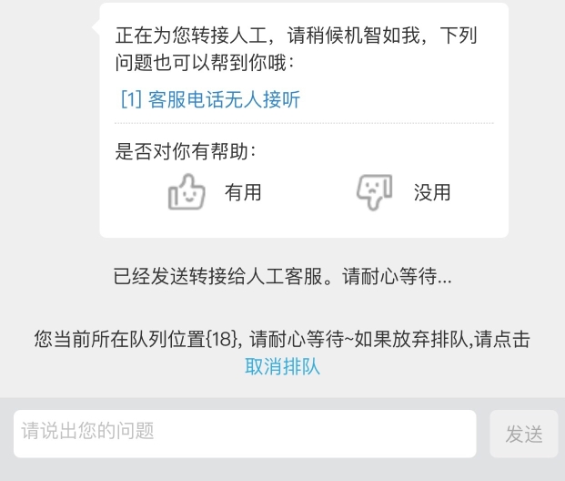 陈女士不甘心,继续点击“转人工”,新一轮排队就此展开。三分钟后,陈女士几乎要放弃时,对话框里弹出“我姓董,很高兴为您服务,请问有什么可以帮您”。足足耗了15分钟,前后排了3次队,才总算来人,还真是“千呼万唤始出来”。