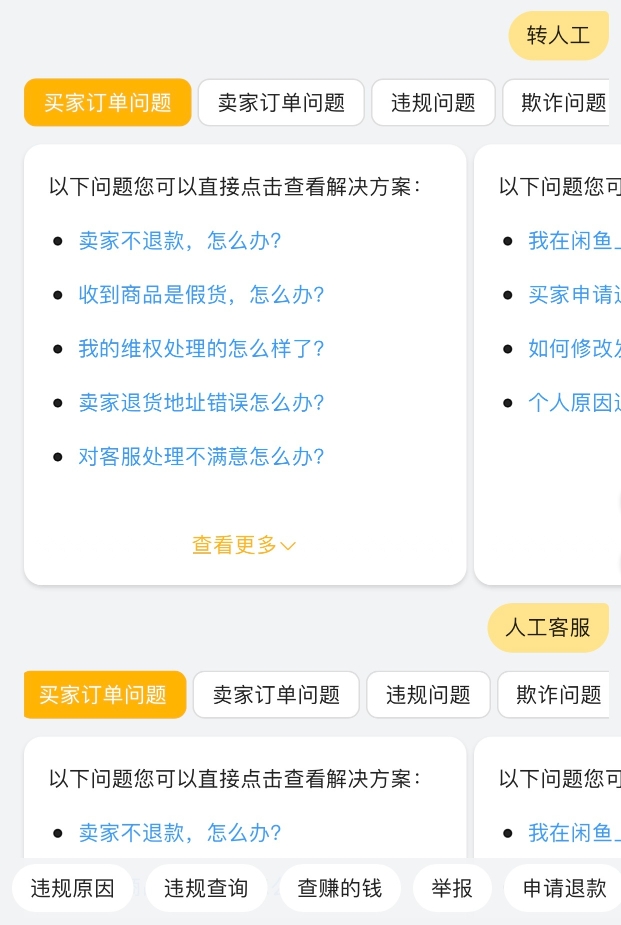 在对话框中输入“转人工”,页面显示的只有更多列表,包括买家订单问题、卖家订单问题、违规问题、欺诈问题等,却始终不见“人工”。记者又尝试输入“人工”“人工客服”“人工服务”等多个关键词,页面给出的都是同样的结果,唯独没有“转人工”的选项。