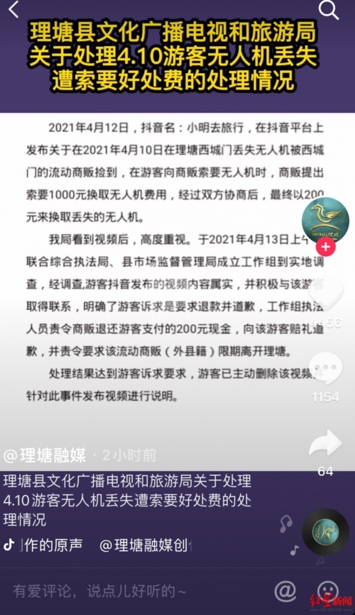 情况称,4月12日,抖音名“小明去旅行”在平台上发布视频:4月10日在理塘西城门丢失无人机被流动商贩捡到,向其索要时,商贩提出1000元换取无人机费用,经过双方协商后,最终以200元换取丢失的无人机。