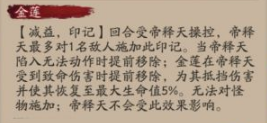 【减益,印记】回合受帝释天操控,帝释天最多对1名敌人施加此印记。当帝释天陷入无法动作时提前移除;金莲在帝释天受到致命伤害时提前移除,为其抵挡伤害并使其恢复至最大生命值5%。无法对怪物施加;帝释天不会受此效果影响。