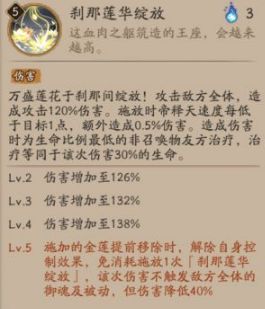 Lv.5 施加的金莲提前移除时,解除自身控制效果,免消耗施放1次【刹那莲华绽放】,该次伤害不触发敌方全体的御魂及被动,但伤害降低40%。