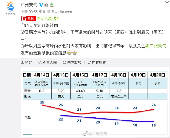 据@广州天气,15-16日受冷空气和切变线影响,广州市将有大到暴雨,并伴有短时强降水、强雷电和短时大风等强对流天气;17日起降水逐渐减弱。