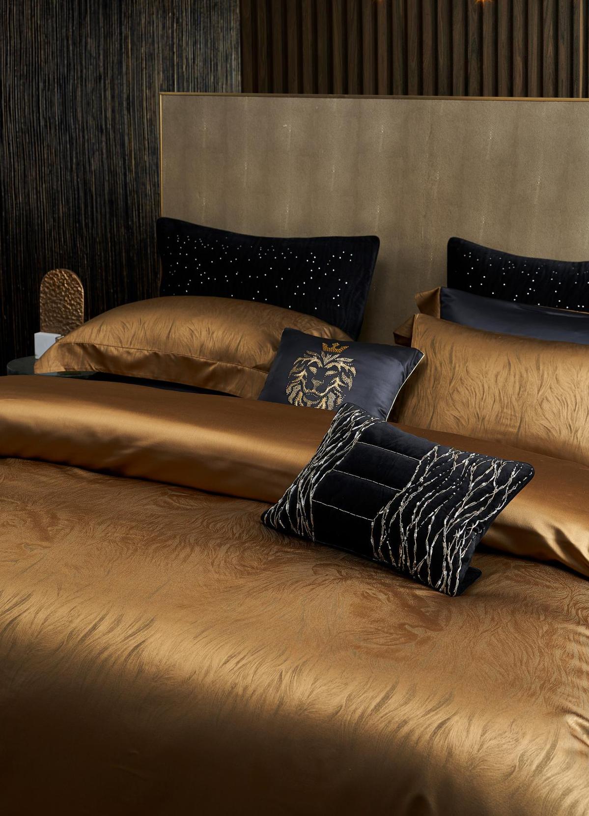 “这款产品采用的是行业最高标准6A级桑蚕丝用料,面料柔滑、温润贴肤”、“产品上的图样,采用品牌独创的像素级细描工艺,费时2163小时笔笔勾勒,栩栩如生还原狮子画像”、“品牌率先采用高定手工钉珠工艺,将床品高定时装化”……日前,在梦洁一旗舰店内,一位身着正装、佩戴着白手套的导购,正在温文尔雅地向顾客介绍最新推出的春夏奢品级床品“王者归来”。