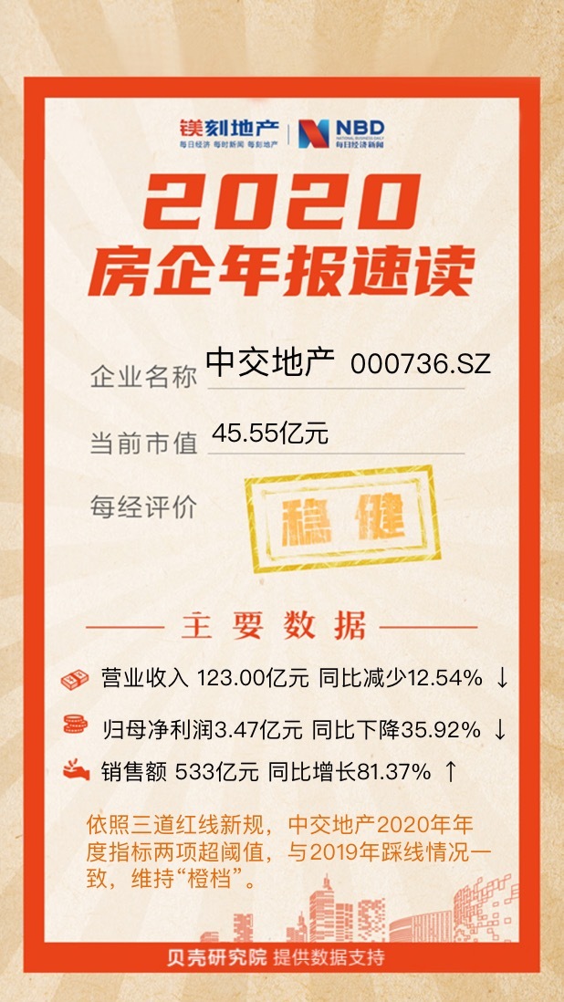 根据贝壳研究院统计,依照“三道红线”融资新规,中交地产剔除预收款后的资产负债率为83.4%,较上年同期上升约0.8个百分点仍超出阈值;净负债率为296.4%,较2019年末上升约146.2个百分点;现金短债比为1.43,较上年同期下降约0.34。由此,中交地产2020年年度指标两项超阈值,与2019年踩线情况一致,维持“橙档”。
