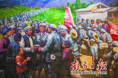 城口镇的红军街上,一幅油画再现红军与粤北山区百姓之间的军民鱼水情。