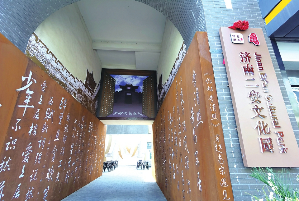 4月14日,在印象济南“汉字记忆空间”石敢当摩崖艺术博物馆,济南首个“二安文化园”已经初步成型。在文化园入口处,两侧墙壁安装了大型的书法灯箱,上面展示了辛弃疾与李清照的诗词作品。露天小广场搭建了木制仿古小舞台、增加了水池,水池四周的透明玻璃上也全部刻上了“二安”诗词,通过汉字和书法的方式展现“二安”诗词,推广济南“二安”文化。(本报记者崔健摄)