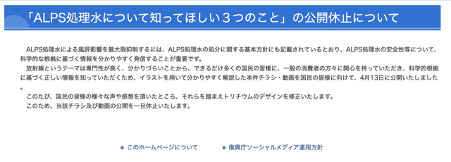 在进行了“将放射性氚做成吉祥物”这一奇葩操作后的次日,日本复兴厅宣布将修改相关设计,并将此前公开的传单和视频暂时下架。