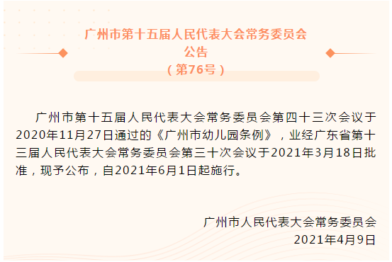 4月14日,广州市第十五届人民代表大会常务委员会发布公告,《广州市幼儿园条例》(下称《条例》)业经批准,自2021年6月1日起施行。自1997年2月5日起施行的《广州市幼儿教育管理规定》同时废止。