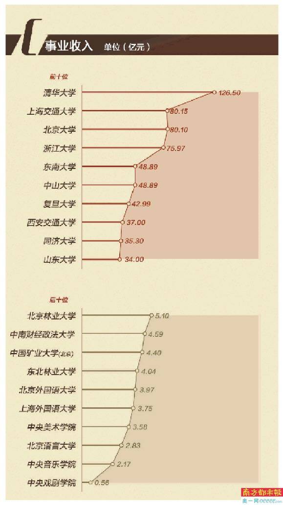 从数额来看,事业收入排名第一的依然为清华大学,达126.50亿元,仍然为75所高校中最有钱也最能挣钱的高校。