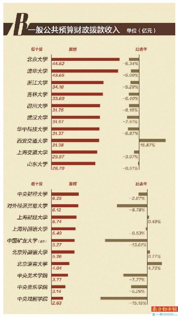 今年75所高校预算财政拨款依然呈“紧缩”状态,财政拨款相较去年下降总计54.22亿元。