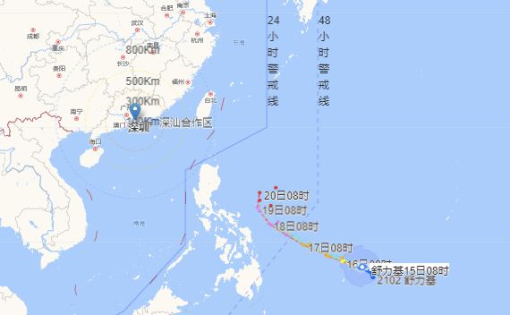 另外,预计2102号台风“舒力基”将以每小时5-10公里的速度向西偏北方向移动,强度逐渐增强,最强可达强台风级或超强台风级(15-16级,48-55米/秒);19日前后,“舒力基”将在东经125度附近(菲律宾东部近海)转向东北方向移动,强度逐渐减弱。“舒力基”进入南海海域可能性极小,对深圳市无直接影响。