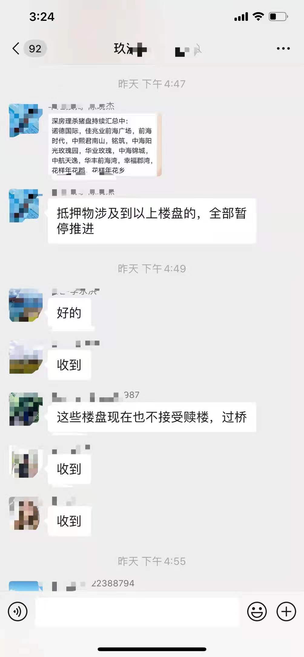 与此同时,一张群聊信息显示:“抵押物涉及到以上楼盘的,全部停止推进”;“这些楼盘现在也不接受赎楼,过桥”。并附上与上述《暂停网红关注楼盘及关联人员业务进件》相同的楼盘名单。对此,有知情人表示,该截图来源一家贷款中介机构,只要是这些楼盘的抵押贷款,银行都不接。