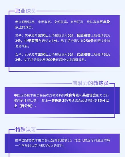 据介绍,能进入绿色培训通道的球员需要满足参加顶级联赛、中甲联赛、女超联赛、女甲联赛一线队赛事五年及以上。
