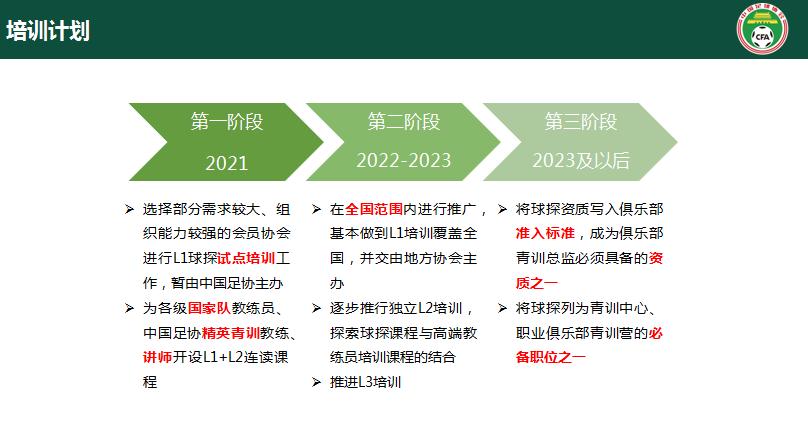 据了解,中国足协将在今年选择部分需求较大、组织能力较强的会员协会进行L1球探试点培训工作,并为各级国家队教练员,中国足协精英青训教练、讲师开设L1+L2连读课程。明年将在全国范围内进行推广。