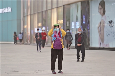 昨日,王府井大街,游客用纱巾包裹着防沙尘。新京报记者 王飞 摄