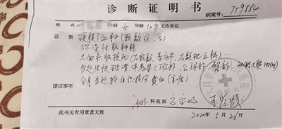 大同市第三人民医院2020年5月26日出具的诊断证明书显示,朵朵头部硬膜下血肿,弥漫性脑肿胀,存在大面积脑梗死。同时,身上会阴部、臀部、双侧大腿内侧有多处皮肤破溃并伴有感染,全身多处软组织损伤贫血。
