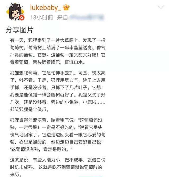 张碧晨闺蜜发文分享了《狐狸和葡萄》的故事,狐狸吃不到自己心爱的又香又甜的葡萄,却还酸酸地表示“这葡萄没熟,肯定不好吃”。