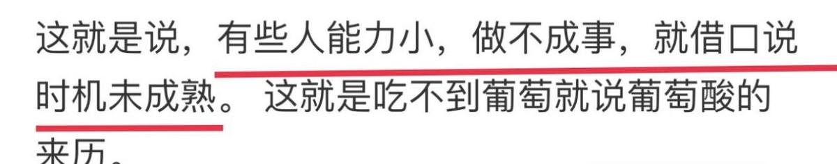 这个“吃不到葡萄说葡萄酸”的故事,很多人从小就知道,张碧晨的闺蜜还特意写道:“有些人能力小,做不成事,就借口说时机未成熟”,疑似在内涵邓紫棋。