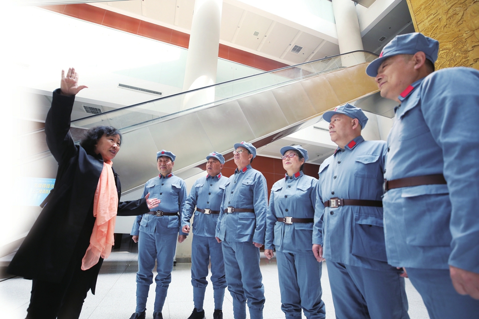“湘江岸你燃起火炬冲天亮,号召工农闹革命,井冈山你率领我们打天下,红旗一展满地红……”10:30,穿着红军演出服的吕升堂放开嗓子,和其他几名队员合唱了一曲《红军战士想念毛泽东》,嘹亮的歌声立刻在大厅中回响起来。