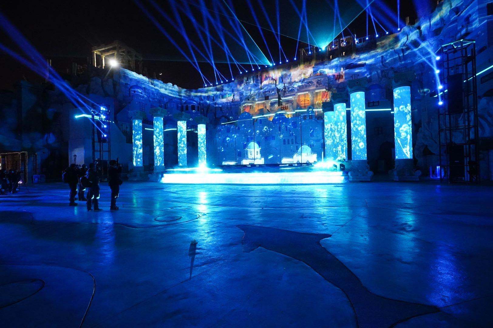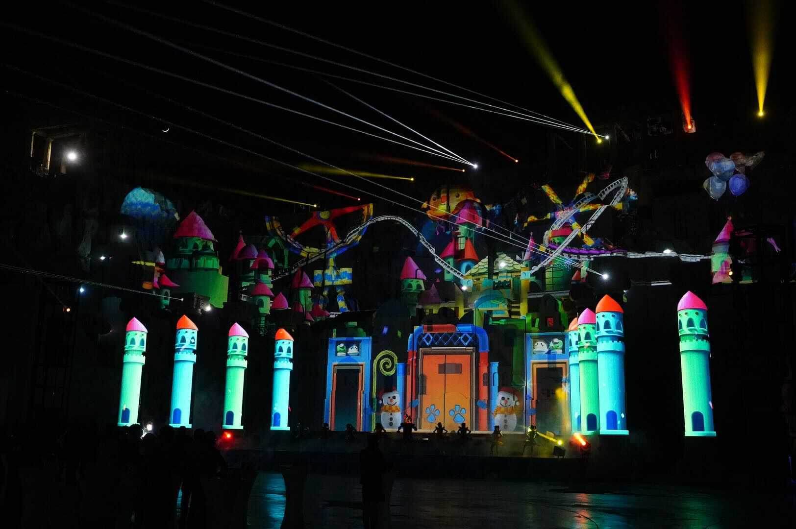 据介绍,北京欢乐谷六期·天光夜谭项目启动于2018年,在现有主题区的基础上,全园区应用多媒体、算法影像、投影互动等技术,布置近100万颗灯珠、万余条彩色光源灯带、千余台投影机,打造十余处打卡地和光影秀场。