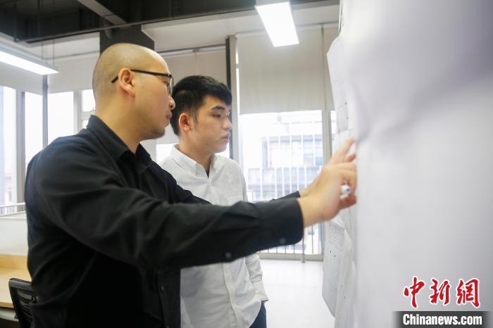 图为澳门青年设计师蔡敏德(左)、龚浩赐在位于珠海横琴的办公室内研究建筑图纸。 王骏 摄