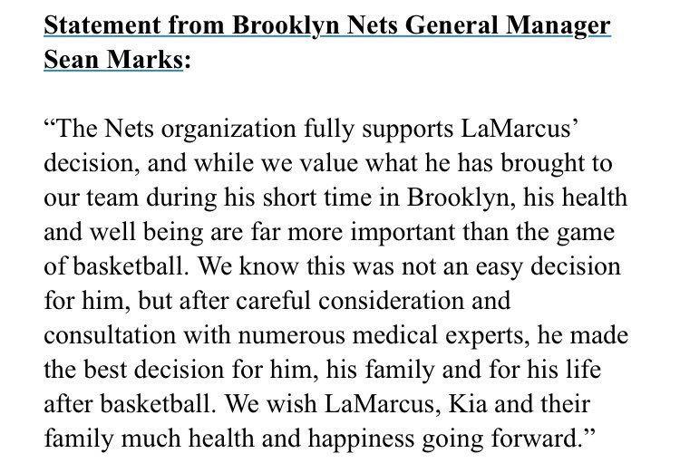 随后篮网总经理肖恩 - 马克斯发表声明:" 篮网完全支持阿德的决定,我们珍视他在篮网的短暂时光里所带来的东西,他的健康安乐比比赛重要得多。我们深知这对他来说是个艰难的决定,但在谨慎考虑和咨询过大量的医学专家后,阿德做出了对他、对他的家人以及对他篮球外的生活最好的决定。我们希望阿德,他的妻子和他们一家今后健康喜乐。"