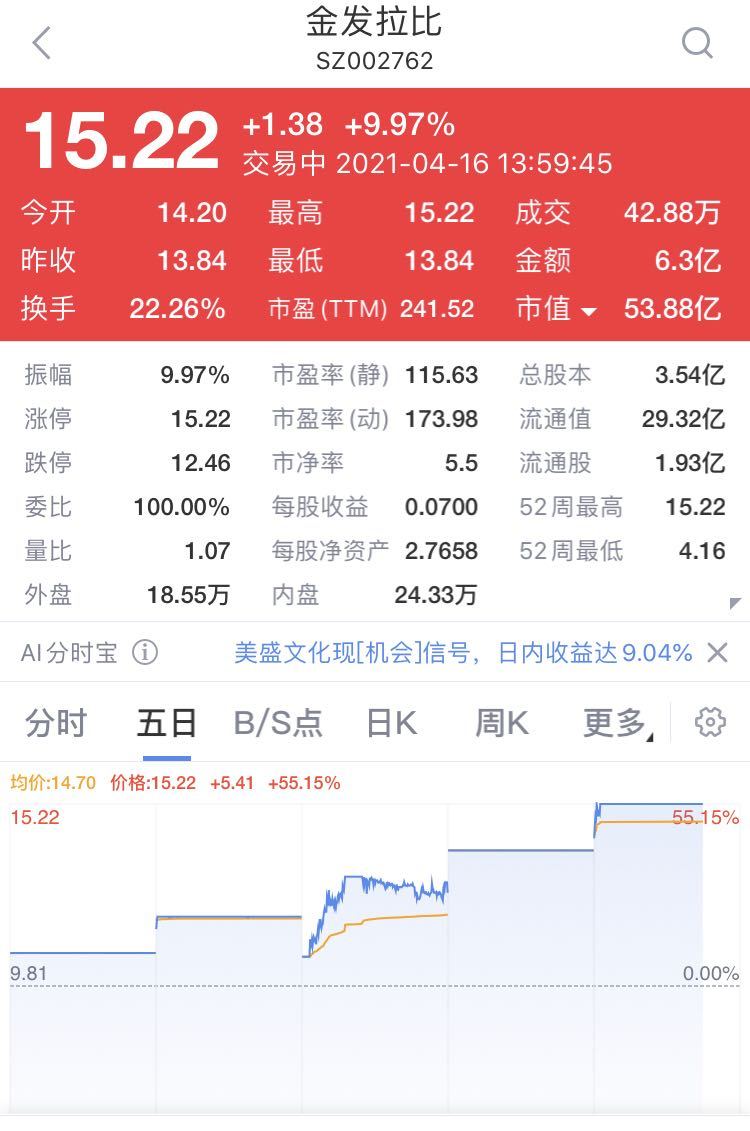值得注意的是,金发拉比开盘便被迅速拉至涨停,金发拉比股价自今年2月起触底反弹,自3月底以来,获得市场资金强力追捧,近12个交易日已揽获10个涨停,期间涨幅超过140%,公司市值也由20亿元级别的超小市值翻倍至逾50亿元。4月16日再度涨停,股价已从4.16元涨至15.22元。