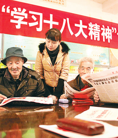 党的十八大召开后,河北省永清县后奕镇董相庄村,村民在工作人员辅导下,学习十八大精神。