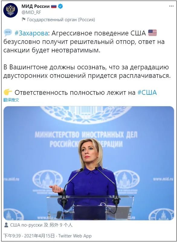 俄外交部推文:美国的侵略行为将得到坚决反击