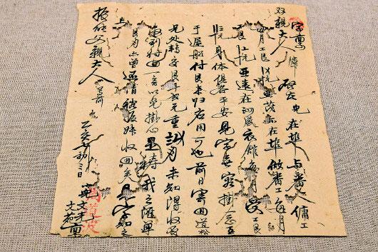 1875年,文光文苑在海外写给父亲振能的信。这份是目前江门五邑地区发现并记录在案的最早的银信。 周华东 摄