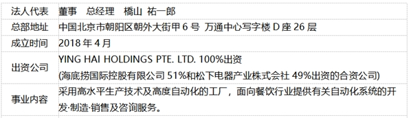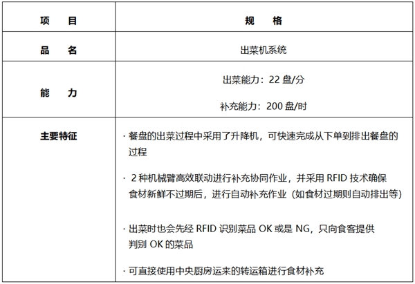 连锁火锅企业【海底捞】与松下集团合资创办了北京瀛海智能自动化科技有限公司,于2018年10月,向海底捞首家智慧餐厅的厨房系统引入了自动出菜机系统。基于平板终端的订单,本系统可将装有订单食材的餐盘从冷藏仓库搬运开始直至放置于配餐托盘的整个过程由手动作业全部转化为自动化作业。
