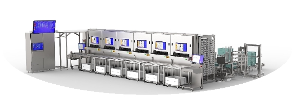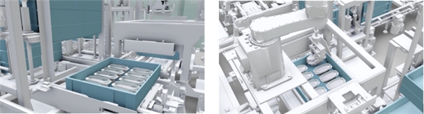 食材的物流加工中心被称为中央厨房,往返中央厨房与店铺间的是转运箱,本设备可将从中央厨房运至店铺的转运箱直接整箱放置于补充台,机械臂可从转运箱直接取出餐盘进行补充作业。该流程会进一步扩大无人化流程,外无入侵,提升食品安全管理。