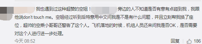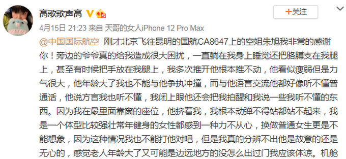 4月15日,有网友发稿称要感谢北京飞往昆明的国航CA8647上的空姐朱旭:在自己对边上爷爷的一些行为非常不满但又无法沟通的时候,多亏了这位空姐及时和她沟通,并帮她换了座位。