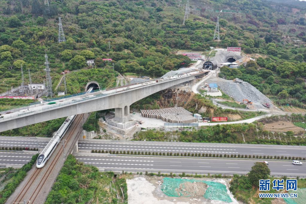 4月16日拍摄的新建福厦铁路南塔山隧道口延伸的新建福厦铁路青口特大桥(上)与杭深铁路(中)及福州绕城高速公路(下)(无人机照片)。