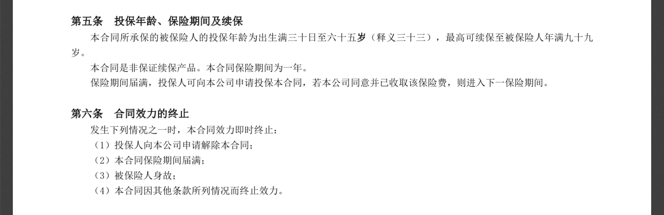 孙雪提供的一份新保险条款明确写到,“本合同是非保证续保产品,本合同保险期间为一年”。