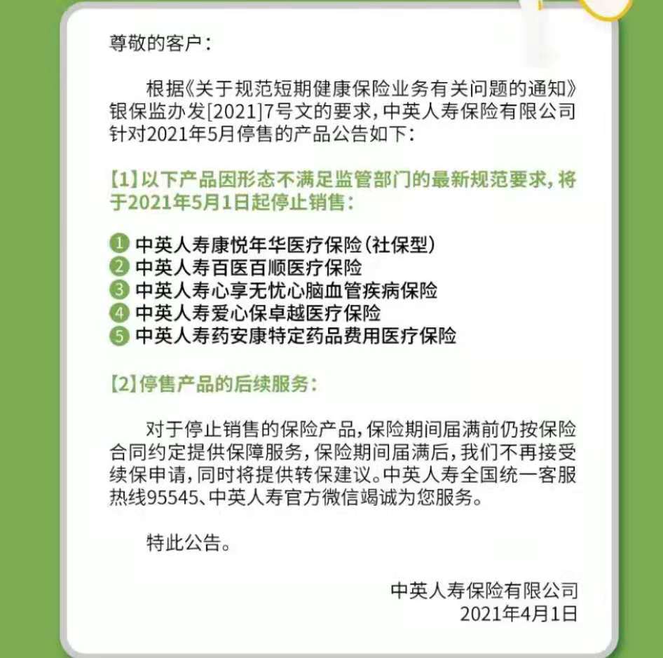 4月1日,中英人寿发布也发布了部分短期健康险停售公告,中英人寿百医百顺医疗保险等五款短期健康险产品于5月停售。