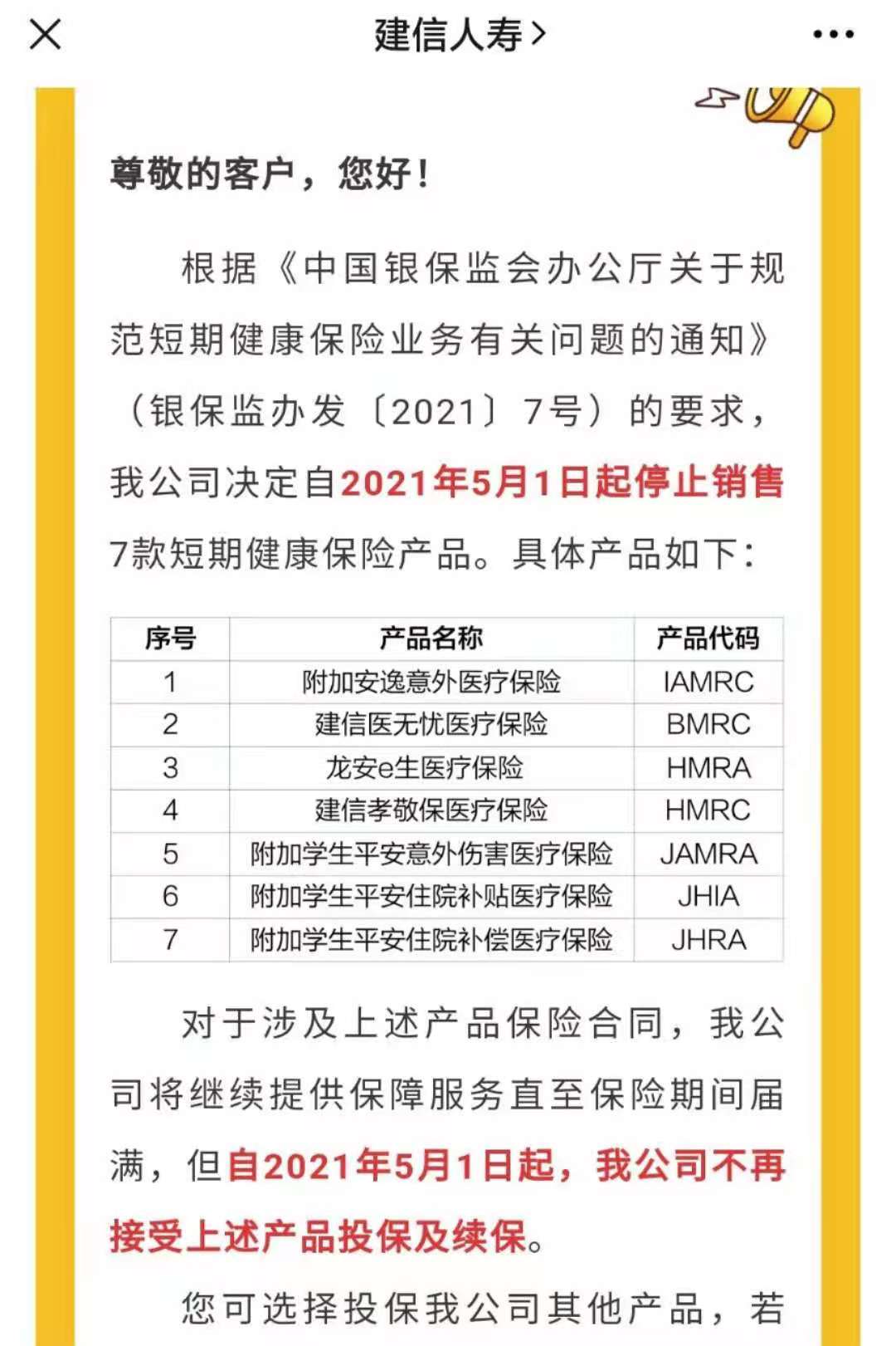 建信人寿停售7款短期健康保险产品 来源:建信人寿微信公众号