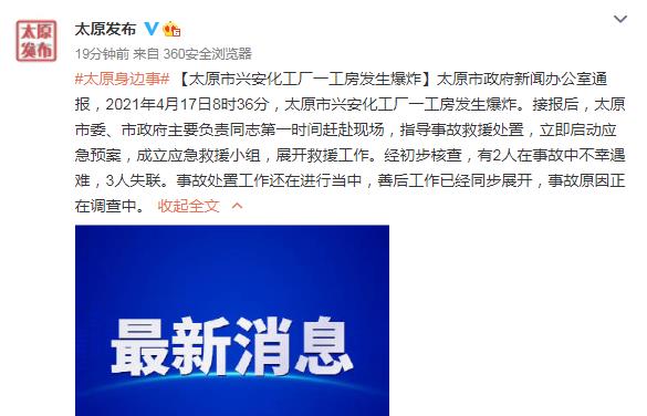 中新网4月17日电 据中共太原市委外宣办太原市人民政府新闻办官方微博消息,太原市政府新闻办公室通报,2021年4月17日8时36分,太原市兴安化工厂一工房发生爆炸。经初步核查,有2人在事故中不幸遇难,3人失联。