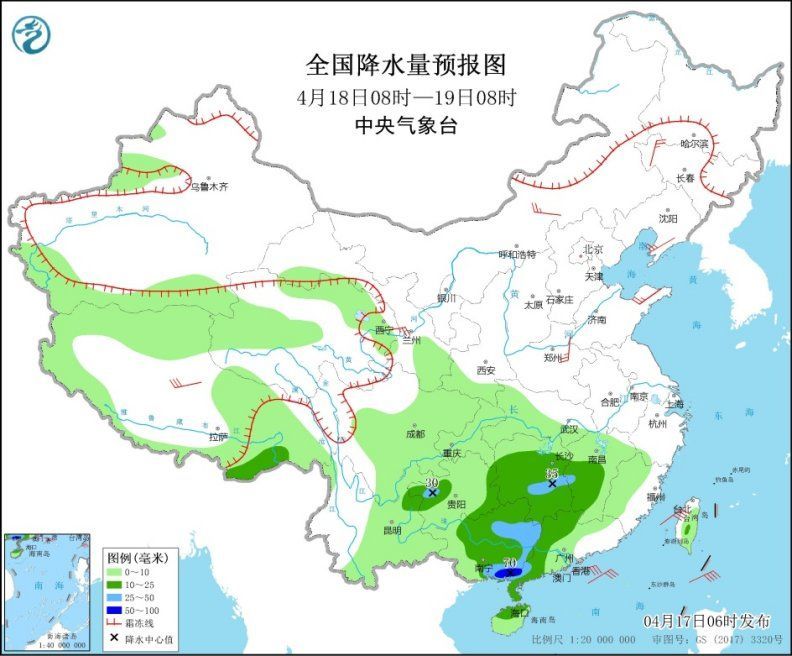 今天,西南地区东部和南部、华南中西部等地的部分地区有中到大雨,其中,云南南部、广西南部等地局地有暴雨(50~70毫米)。