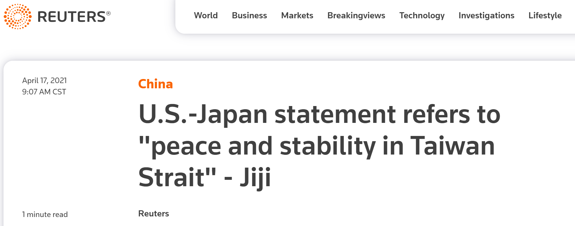 菅义伟在记者会上声称,“日本和美国已就台湾海峡和平与稳定的重要性达成一致,并在此次会谈上重申了这一点。”