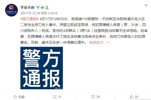据成都市公安局天府新区分局官方微博消息,4月17日12时30分,该局接110报警称:天府新区华阳街道伏龙小区二街发生持刀伤人事件。民警立即赶至现场,将犯罪嫌疑人杨某(男,31岁,四川资阳市人)抓获。受伤的4名群众(3男1女)经医院救治后暂无生命危险。经审查,犯罪嫌疑人杨某交代了因生活琐事与母亲发生争吵,后持刀伤害他人的犯罪事实。目前,案件正在进一步调查处理中。