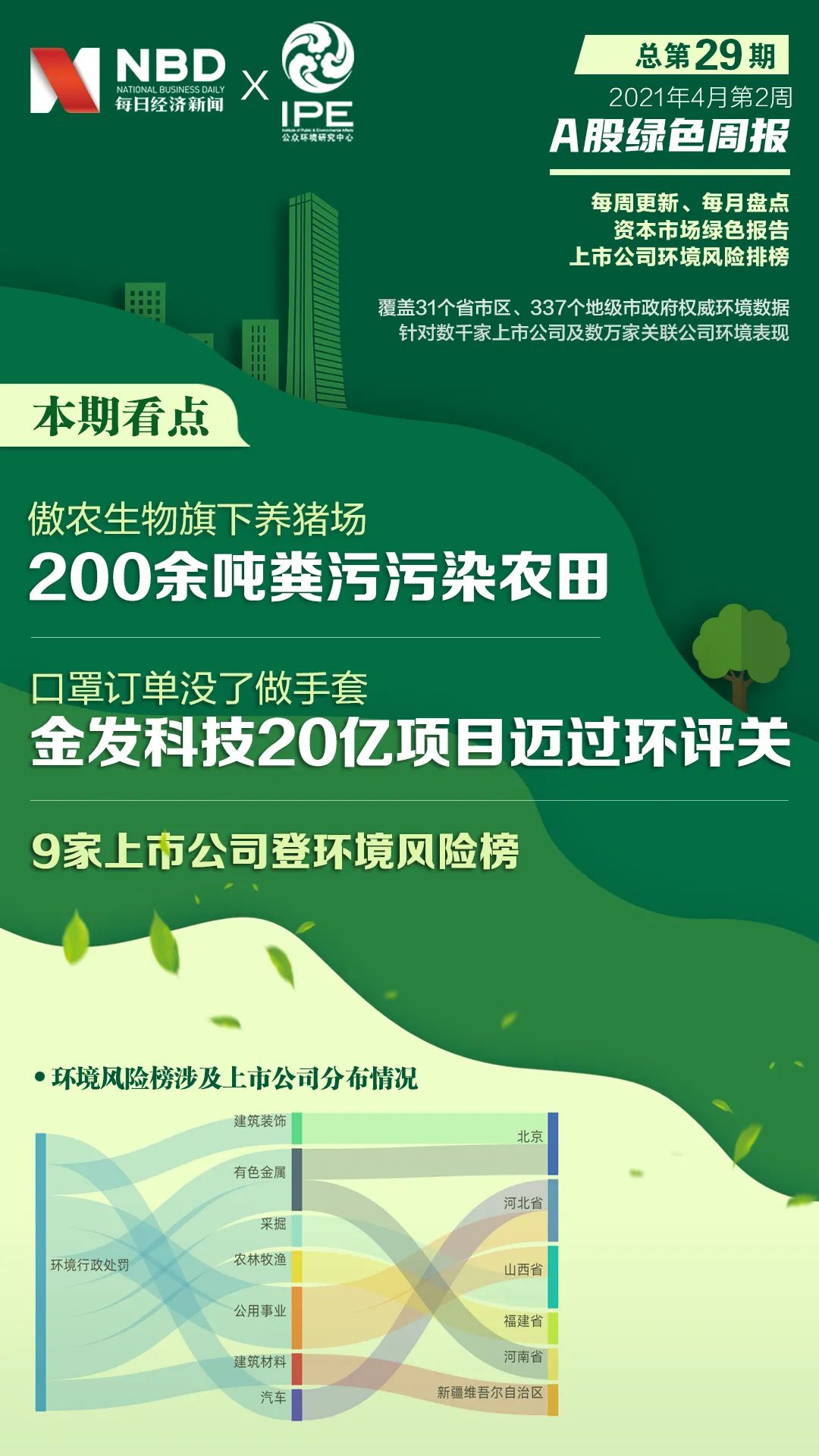 每日经济新闻联合环保领域知名NGO公众环境研究中心(IPE),自2020年9月起,基于31个省市区、337个地级市政府发布的环境质量、环境排放和污染源监管记录等权威数据来源,每周收集剖析中国数千家上市公司及其旗下数万家公司(包括分公司、参股公司和控股公司)的环境信息数据,发布“A股绿色周报”,旨在借助环境数据库及专业解析、传播能力,让资本市场的上市公司经营活动中的环境信息更加阳光透明。