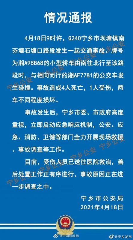 据@宁乡发布 ,4月18日9时许,G240宁乡市坝塘镇南芬塘石塘口路段发生一起交通事故。牌号为湘A98B68的小型轿车由南往北行至该路段时,与相向而行的湘AF7781的公交车发生碰撞。事故造成4人死亡,1人受伤,两车不同程度损坏。事故发生后,公安、应急、消防、卫健等部门全力开展现场救援、事故调查等工作。目前,受伤人员已送往医院救治,善后处置工作正有序进行,事故原因正在进一步调查之中。