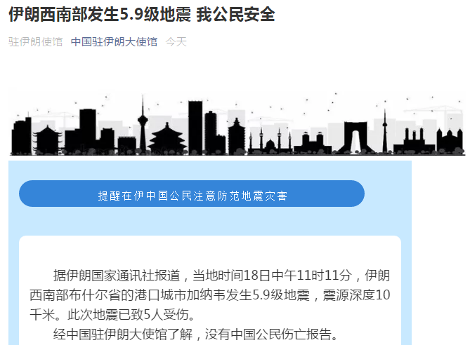 1丨伊朗发生5.9级地震,驻伊大使馆:我公民安全