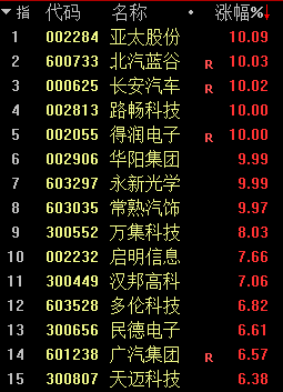 而在周五,华为无人驾驶技术加持,北汽高端纯电轿车上市,引发市场一个新热点。受消息刺激,北汽蓝谷、长安汽车、路畅科技、华阳集团、得润电子、常熟汽饰等无人驾驶概念股纷纷涨停。