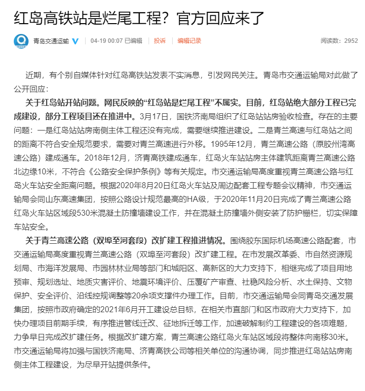 近日有个别自媒体针对红岛高铁站发表不实消息,引发网民关注。19日凌晨,青岛市交通运输局对此做了公开回应: