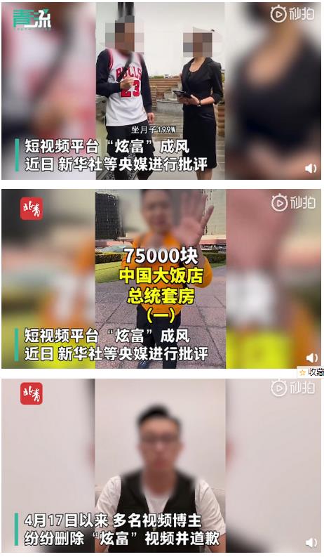 花75000元住一晚“总统套房”,花199万元“坐月子”……短视频平台“炫富”成风,创作者一味追求流量,满屏的纸醉金迷腐化社会风气,新华社等央媒进行批评。4月17日以来,多名视频博主纷纷删除“炫富”视频并道歉。记者搜索博主“大LOGO”后发现,短视频平台出现“请理性消费,建立健康消费观”的温馨提示。
