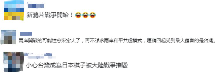 也有网友担心,“新鸦片战争开始!”“两岸开战的可能性愈来愈大了,再不谋求两岸和平共处模式,烟硝四起受到最大伤害的是台湾。”“小心台湾成为日本棋子被大陆战争摧毁。”