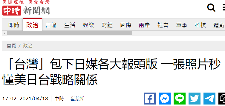 日本学者小笠原欣幸18日在脸书发出贴文,称日本报纸头条都是“台湾”,不只头版,内页的大篇幅报道也都围绕台湾。他还在贴文中附上一张日本4份报纸头版照片,包括《读卖新闻》《产经新闻》《朝日新闻》及《每日新闻》,都以头版头条报道“日美联合声明提及台湾”。